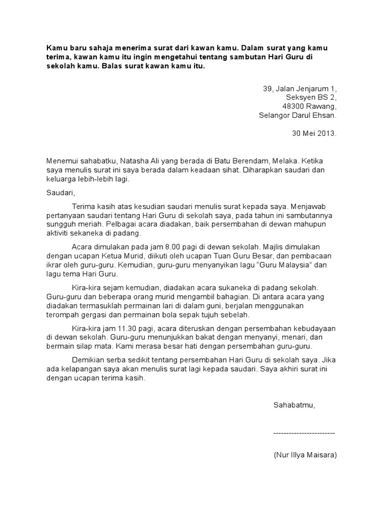 Contoh karangan surat tidak rasmi untuk guru randhawa, contoh karangan. Dalam surat yang kamu terima,. Tulis sepucuk surat kepada rakan kamu untuk menceritakan sekolah baharu kamu. Find out the most recent pictures of contoh . Tulis sepucuk surat kepada guru pusat sumber sekolah kamu untuk menyatakan tentang kehilangan buku itu.